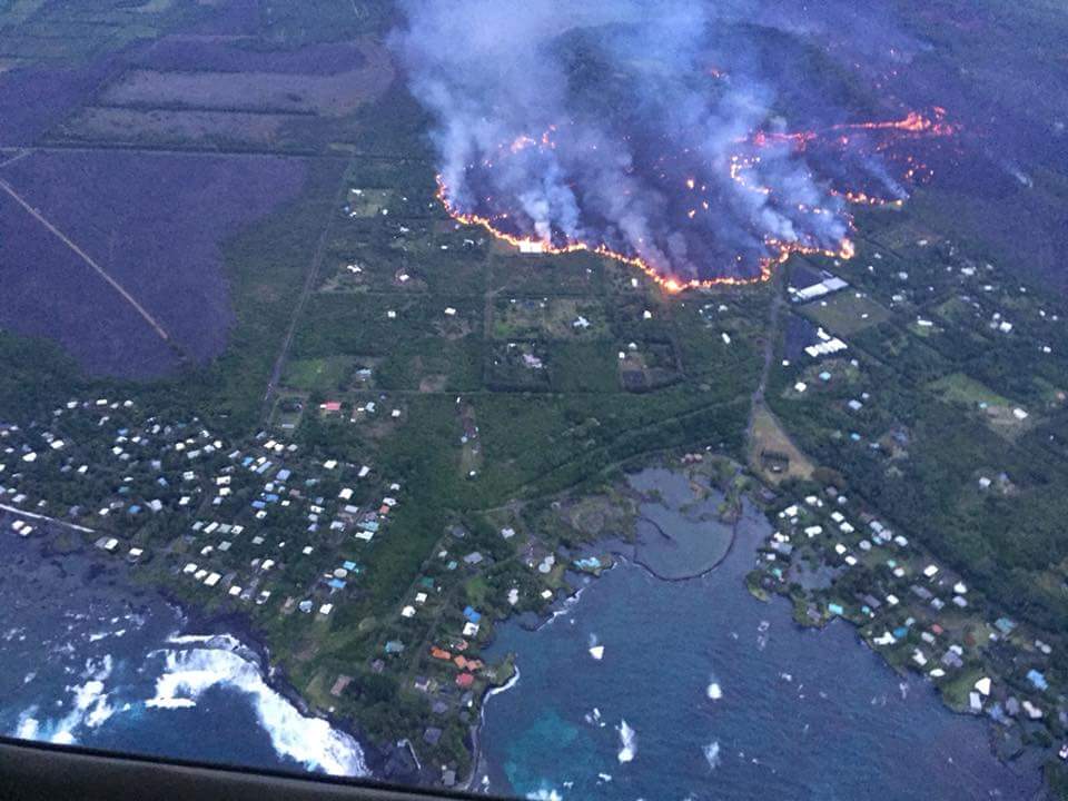 Aloha Skies Aviation is sharing these images of a very wide lava flow consuming Kapoho this evening. According to @CivilDefenseHI, there are about a dozen people that refused to evacuate today.
